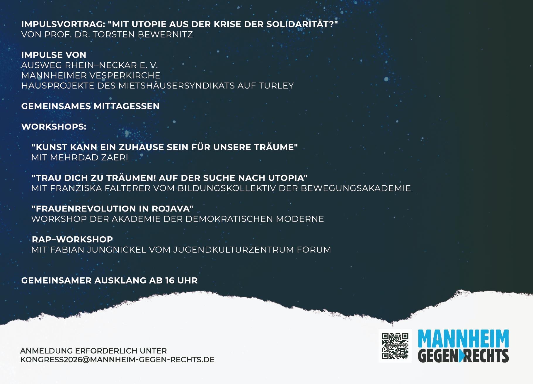 Diese haben vor allem seit der Gründung der AfD im Jahr 2013 eine neue starke Basis erhalten, die weit über die ursprünglich neonazistisch geprägte Szene in der Entstehungszeit des Bündnisses Mannheim gegen Rechts hinausweist. Diese Basis ist mit ihrer politischen Ausrichtung tief in die bürgerliche Mitte vorgedrungen. Als Mannheim gegen Rechts sehen wir die Notwendigkeit, die Menschen in unserer Stadt für die Gefahren und die Auswirkungen des gesellschaftlichen Rechtsrucks zu sensibilisieren und eine Gegenbewegung zu schaffen, die der extremen Rechten den politischen Raum nimmt und das Bild einer solidarischen Gesellschaft entgegenstellt.
